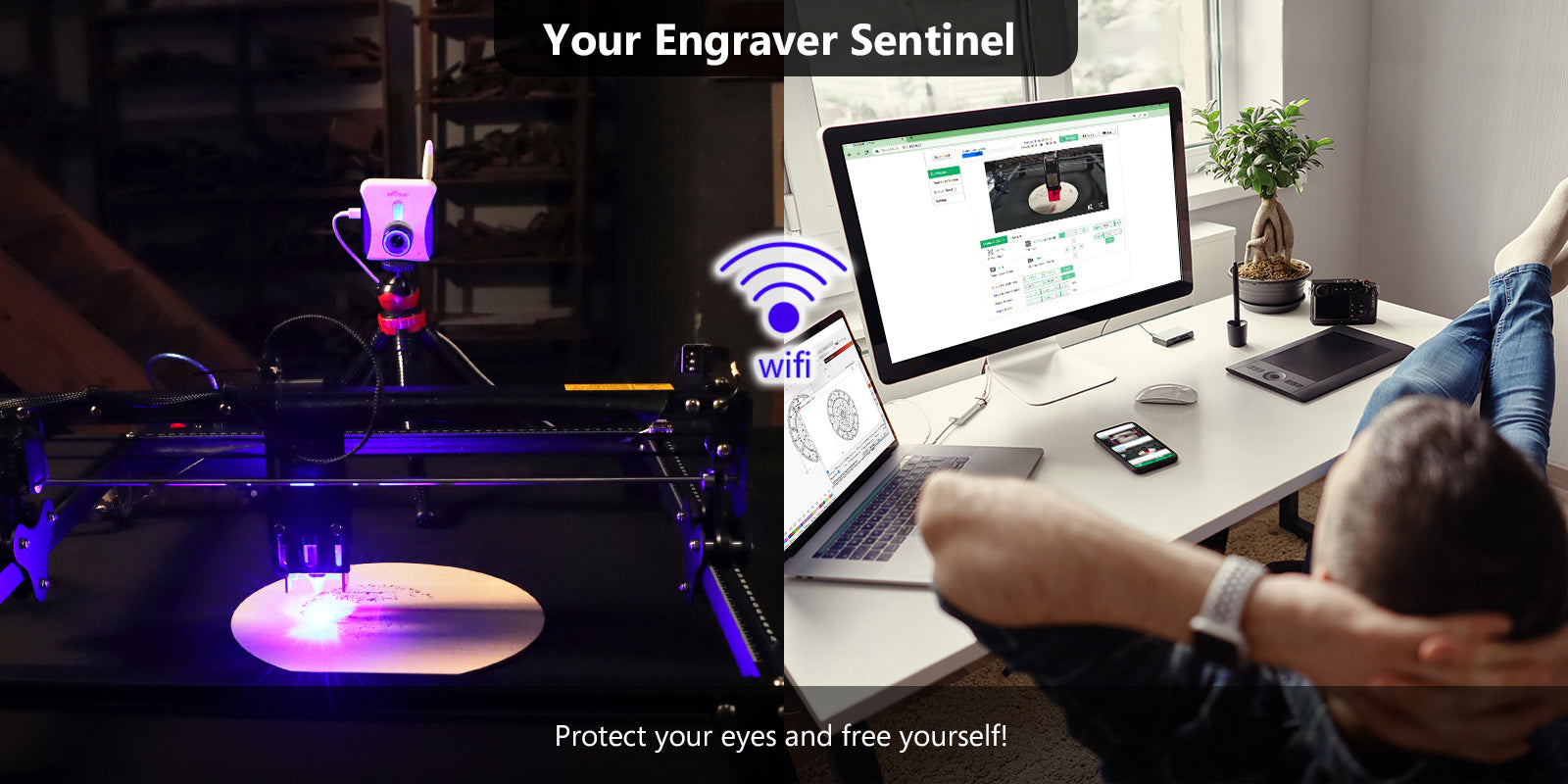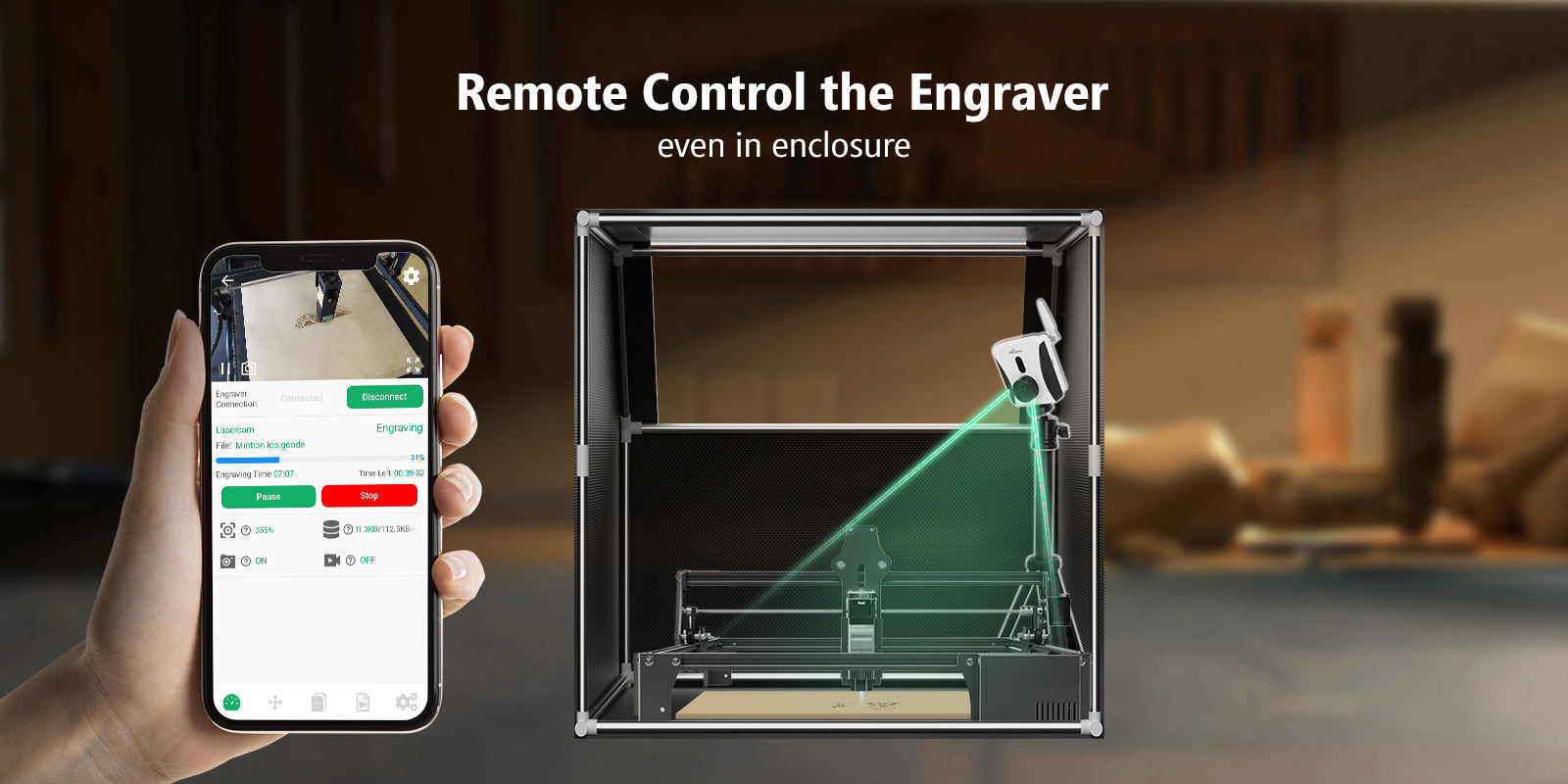 Remote Monitor & Control via PC or Phone, view and manage your engraving process remotely, freeing you to multitask and safeguarding your eyes from prolonged laser exposure and exposure to harmful/bad smelling gases. (Note: The normal usb camera does not support remote view and control)
